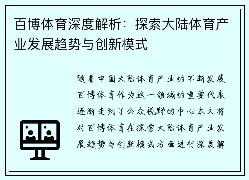 随着中国大陆体育产业的不断发展,百博体育作为这一领域的重要代表,逐渐走到了公众视野的中心。本文将对百博体育在探索大陆体育产业发展趋势与创新模式方面进行深度解析,阐述其在体育产业中扮演的角色以及未来的发展前景。通过对当前体育市场的分析,我们将从四个方面入手,探讨百博体育在推动体育产业创新和发展的关键作用。这四个方面包括:体育产业的快速发展及趋势、创新的商业模式、科技与数字化在体育中的应用、以及未来体育产业的挑战与机遇。通过这些角度,我们将全面解析百博体育如何在行业中引领变革,助力大陆体育产业的蓬勃发展。