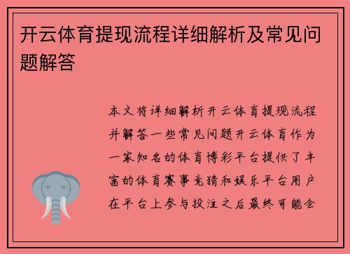 本文将详细解析开云体育提现流程,并解答一些常见问题。开云体育作为一家知名的体育博彩平台,提供了丰富的体育赛事竞猜和娱乐平台。用户在平台上参与投注之后,最终可能会遇到提现操作,了解提现流程及常见问题非常重要。本篇文章将从四个方面进行详细说明:第一,开云体育提现流程的基本步骤;第二,提现所需的条件和注意事项;第三,常见问题解答,帮助用户解决在提现过程中遇到的困惑;第四,如何加速提现操作,确保顺利到账。通过对这些方面的分析,读者可以更好地掌握开云体育的提现流程,避免常见问题,提升操作体验。